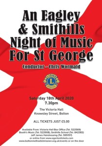 “Bolton’s Eagley Band, which this year celebrates its 170th anniversary, once again returns to the Victoria Hall in conjunction with Smithills Community Choir and Band under the directorship of Musical Director Chris Wormald for their annual Concert For St George. Following another packed and hugely popular evening at their Christmas Concert in December, Eagley and Smithills Community will once again perform and entertain an audience and family friendly programme of popular and well known music which will feature audience participation in Jerusalem, Land of Hope And Glory, Rule Britannia and many other songs and pieces associated with their annual St George’s Concert given on behalf of Rotary Charities. As ever, Eagley and Smithills Community concerts start at 7.30pm with a twenty minute interval at 8.25pm and an anticipated conclusion time of 9.45pm. All tickets are just £5 and will go on sale from February 1st.“