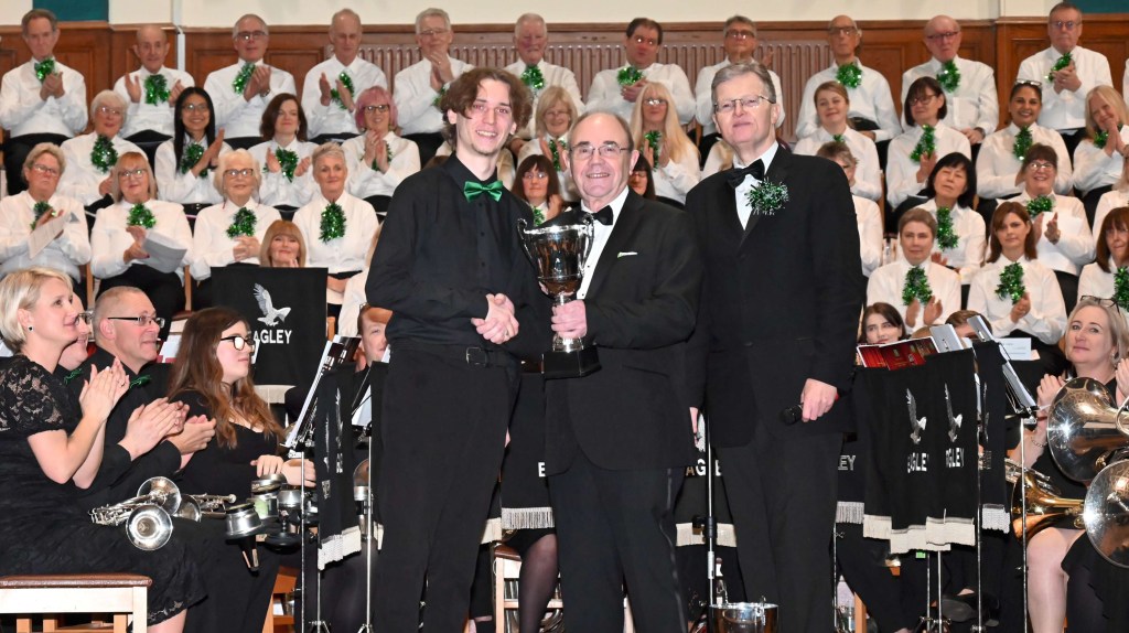 As every December, the first half of our Victoria Hall Christmas Concert features the short trophy presentations made by Band President Gerry Russell and all voted for by band players, except for the MD’s Award. This year’s winners were Harvey Crombleholme (Players’ Player of The Year), Dec Cullen (Band Person of The Year), Becca Crompton (Most Improved Player) and, jointly, Les Fellowes and Will Jordan (MD’s Award).