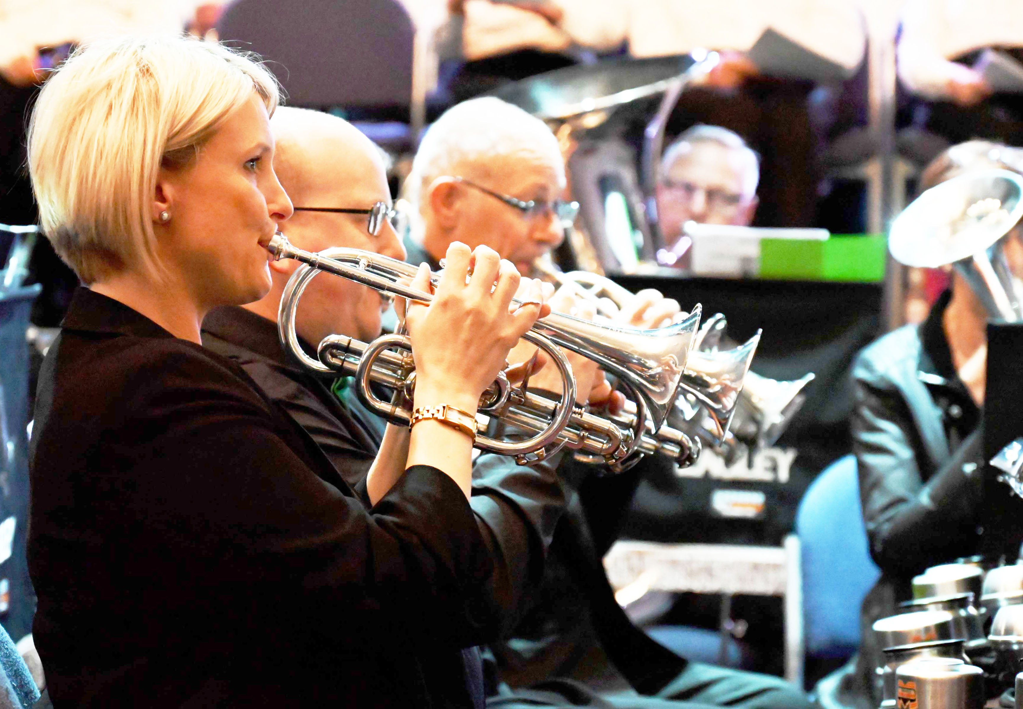 On Saturday night March 29th we once again packed the super modern Bridge Church, just a mile from our Bolton bandroom and complete with its state-of-the-art, multiple video screens (more added since our second sell-out concert there last Spring). Everyone enjoyed a third great concert there to another sell-out Eagley audience and all in the presence of Mrs Diane Hawkins, Lord-Lieutenant of Greater Manchester and her husband. Such was the attendance again that we completely sold out of the glossy programmes and raffle tickets, and the atmosphere in the hall was superb throughout all evening.